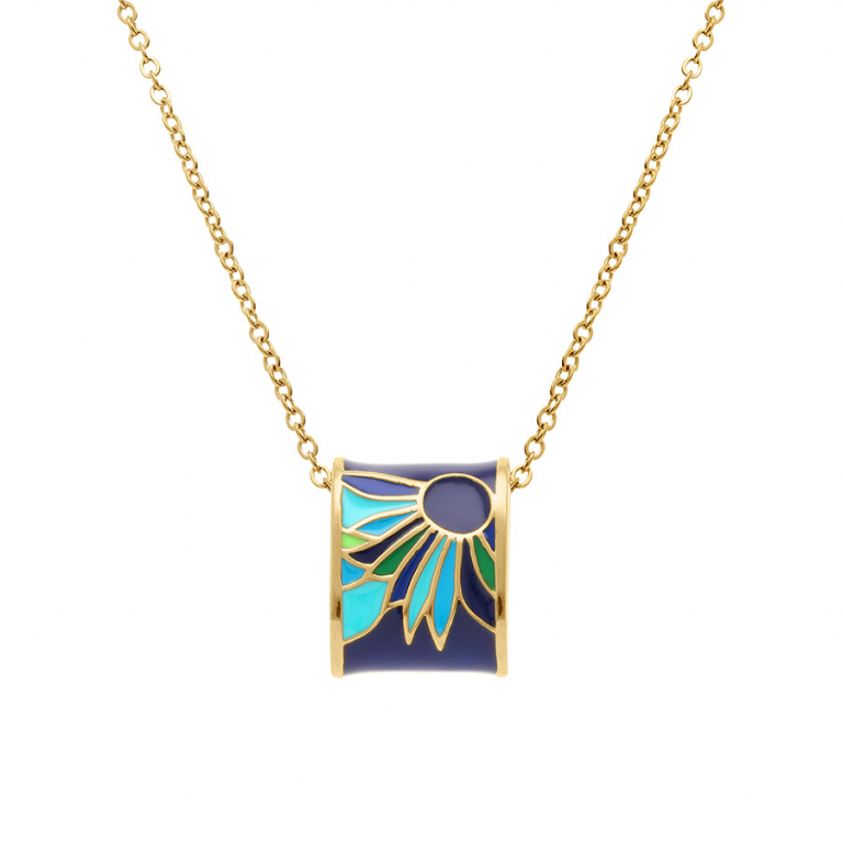 Un Collier acier doré de la marque Stella Mia avec Pendentif tube en acier doré et résine dans un Camaïeu de Bleu Motif Tournesol.